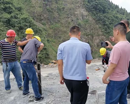 重慶創(chuàng)普達(dá)機(jī)械科技有限公司對(duì)施工現(xiàn)場(chǎng)進(jìn)行了勘察,制定了詳細(xì)的施工方案:一天半鉆孔25個(gè),裝管25支,現(xiàn)場(chǎng)臨空面高約7米,采用3.5X3.5X4米一字排形鉆鉆孔,嚴(yán)格控制鉆孔尺寸和一字排形對(duì)應(yīng)尺寸鉆孔,最終結(jié)果測(cè)量為(裂鏠尺寸)是35米X6米X5.5米共1155方,每支管出方46.2方.